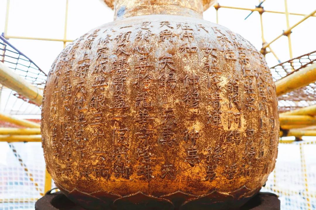 ? ? ? ? 龍華塔是上海地區(qū)保存最完好的宋代樓閣式塔,明人馮遷譽其為“千年飛塔”。舊時,“秋江塔影”與“龍華晚鐘”同樣蜚聲海內(nèi)外。龍華塔頂端塔剎葫蘆,上一次貼金箔修繕是在1984年,歷經(jīng)時間和風雨的洗禮,斑駁銹蝕,金箔缺損嚴重。本次保養(yǎng)維護過程中,維修人員為塔剎葫蘆重貼金箔,再現(xiàn)璀璨金光。