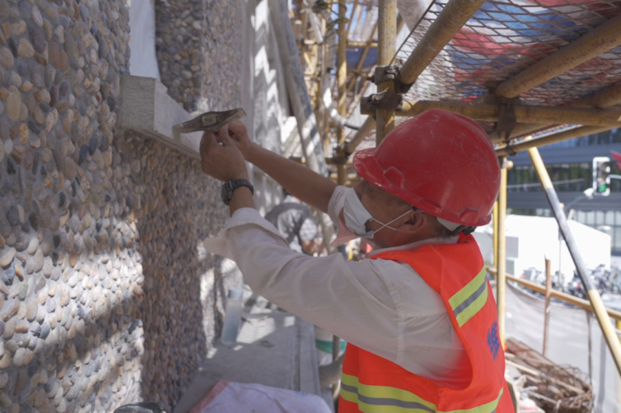 用鵝卵石工藝恢復(fù)立面原有卵石、紙筋灰材質(zhì)? ? ? ? ? ? ? ? ? ? ? ? ? ? ? ? ? ? ? ? ? ? ? ? ? ? ? ? ? ? ? ? 用白色耐候漆冰裂紋恢復(fù)立面原有木質(zhì)門窗