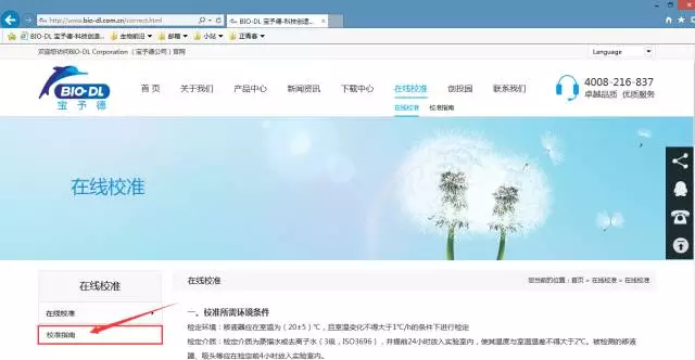 2.點擊下圖紅色箭頭指示的“在線校準”進入移液器在線校準服務。