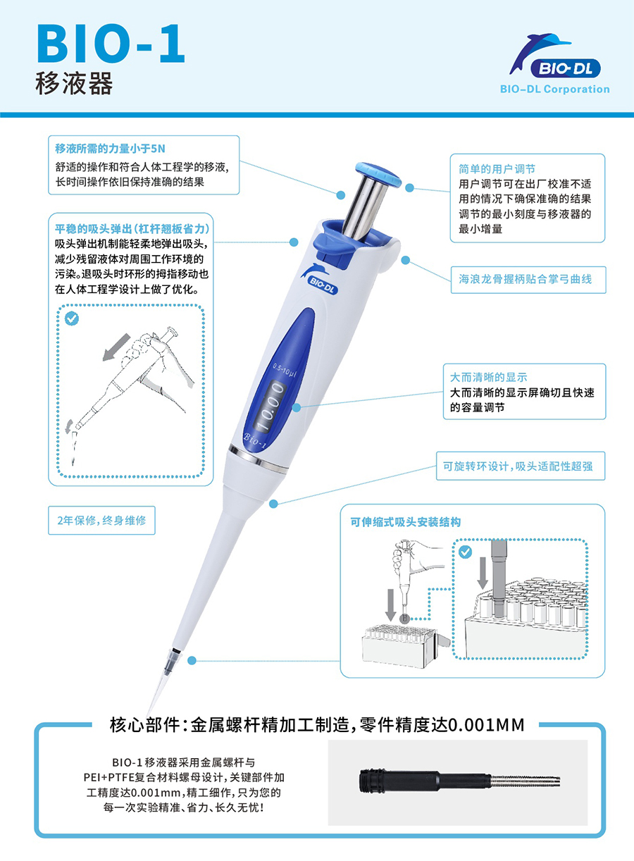 移液器Bio-1特選精良的材質,具有出色的耐化學腐蝕性和抗紫外線性能,可伸縮式圓錐管嘴和滑輪式吸頭彈出器使吸頭更容易裝配和彈出,四位數字顯示窗,為移取各種類型液體提供更精確的結果。涵蓋0.1μ1-10ml單道量程及0.5u1-300ul多道量程。